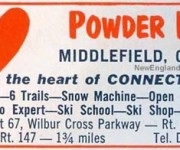 Little is known about 1959-60 ski operations on Powder Hill. A grand opening was held in early 1961, as more than 2,000 skiers visited the slopes on January 21 and 22. Facilities included a lower mountain T-Bar, three rope tows, snowmaking, night skiing, and a skating rink. Trails included the novice Powder Puff and Middlefield and the expert Beserk. Rhode Island native Frank Weston headed up the ski school.