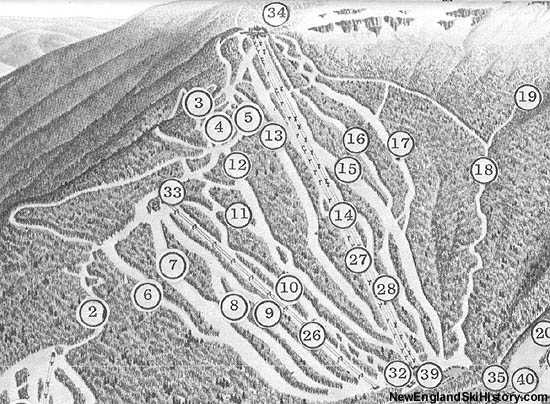 While some trails such as the Perry Merrill had existed in the complex prior to the formal construction, funds were use to cut additional trails. Served by the 6,650 foot long by 2,037 vertical foot four person gondola, the complex was advertised as costing over $2 million. While the top of the Chin is nearly 4,400 feet in elevation, the lift terminated about 600 vertical feet short of it. The new complex, consisting of mostly intermediate and advanced intermediate terrain, debuted for the 1968-69 season.